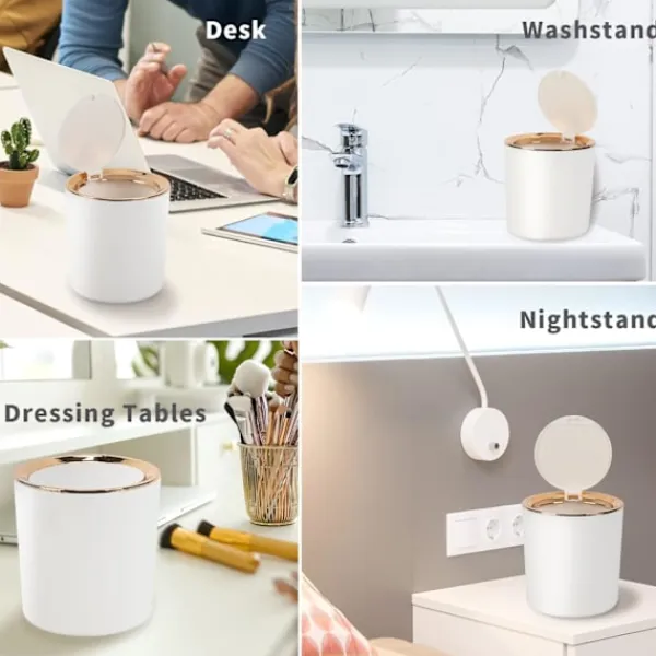 Design med lock: Minikorgen av plast för bord med lock kan öppnas med en knapptryckning, är luktfri och ren, och allt du inte vill se är dolt, vilket är bekvämare och mer hygieniskt. Du kan bekvämt hålla kattlådan medan du tittar på TV eller använder datorn. Dessutom kan du enkelt och snabbt slänga papperskorgen när som helst.