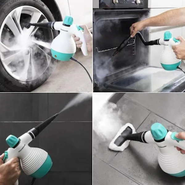 En handhållen ångtvätt med flera användningsområden som inkluderar nio tillbehör för en enkel och komplett rengöring på djupet. Ångtvätten rengör och desinficerar med trycksatt het ånga, är helt fri från kemiska produkter och avlägsnar effektivt fett, mögel och fläckar. Den möjliggör rengöring av hårda ytor såsom kakel, golv, handfat, bänkskivor, dörrar och fönster samt mjuka ytor såsom mattor, sängar, madrasser, täcken och soffor. Den värms upp på endast 3-5 minuter och släpper ut ånga i 15 till 20 minuter.- Handhållen ångtvätt för rengöring- Desinficerar med het ånga- Lämplig till hårda och mjuka ytorSpecifikationer:Färg: Vit, blåMaterial: PlastMått: ca. 29 x 13 x 23 cmKapacitet: 35 clTyp av kontakt: ELängd, kabel: 2.8 mTrycksatt ånga: 3 BARStröm: 1000 WFrekvens: 50-60 HzSpänning: 220-240 VFörpackningen Innehåller:1x Ångtvätt1x Långt munstycke1x Munstycke för fint flöde1x Munstycke för stora ytor1x Tillbehör för stort munstycke1x Runt borstmunstycke1x Flexibel förlängningsslang1x Trasa1x Tratt1x Mätbehållare1x Användarmanual