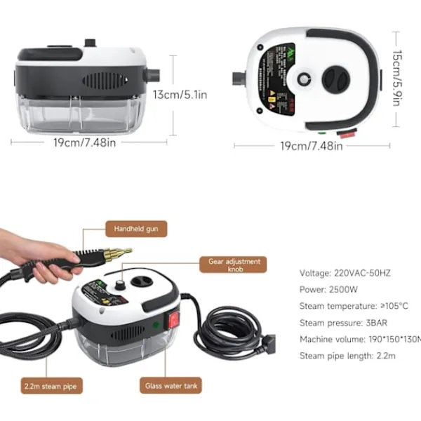 5. Mångsidig rengöring för alla typer av ytor – lämplig för väggar, spisar, ugnar, luftkonditioneringsapparater och bilar. Den kombinerar ånga och skrubbning för att ta bort fett, smuts och svåra skräp i hem eller fordon.1. Snabb ånggenerering vid hög temperatur – – 2 500 W värmeslinga producerar 105 °C högtrycksånga och 3 bar på 10 sekunder och löser effektivt fett och smuts. Den utökade och förtjockade designen säkerställer ett milt tvättmedelsflöde för en djuprengöring.2. Justerbar hastighet och mångsidig flexibilitet – Sex ånghastigheter, tre borsthuvuden och en skrapa för olika ytor. Enknappskontroll och vattentät omkopplare ökar säkerheten, medan teleskopröret når högt i tak och möbler.Steg 3: Kompakt och bärbar design – Med en vikt på endast 1,5 kg och måtten 19 x 15 x 13 cm passar den i små utrymmen och är lätt att bära. Perfekt för rengöring på språng utan att bli trött.4. Stor och hållbar vattentank – – Med en räckvidd på 1 timme (400 ml kapacitet) minimeras påfyllningen. Lägg till tvättmedel för att ta bort envisa fläckar och öka effektiviteten i kök, badrum och bilar.5. Mångsidig rengöring för alla typer av ytor – lämplig för väggar, spisar, ugnar, luftkonditioneringsapparater och bilar. Den kombinerar ånga och skrubbning för att ta bort fett, smuts och svåra skräp i hem eller fordon.*QUDD_RUFC-1017
