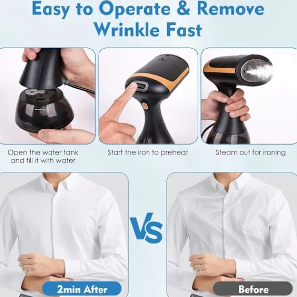 2X Snabbare Rynkborttagning: Vår 1500W klädångare värms upp på bara 30 sekunder och erbjuder 2X snabbare rynkborttagning. Den slätar snabbt ut rynkor och lämnar dina plagg skarpa och luktfria, vilket gör den perfekt för effektiv styling på språng.