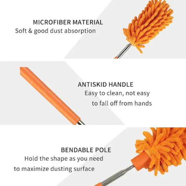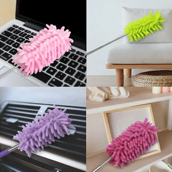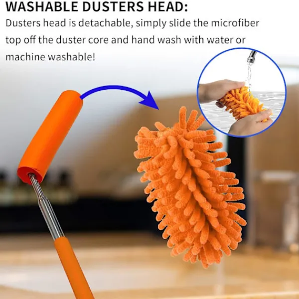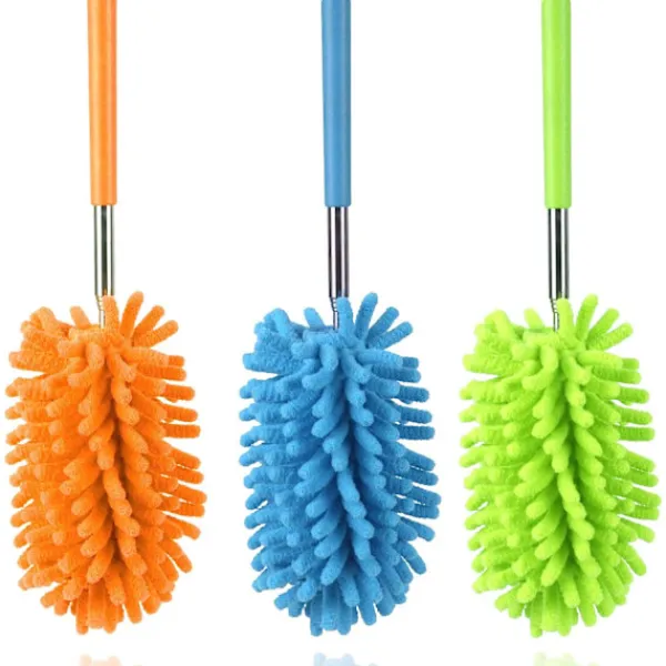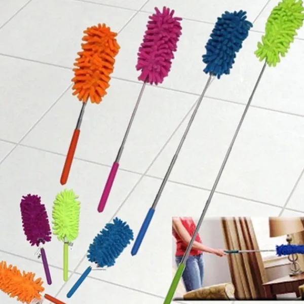 Utdragbara och böjbara, dessa mikrofiber-dammsamlare finns i storlekarna 25-76 cm. Och det 360° roterande dammborttagningshuvudet kan också rengöra tak, takfläktar, ljuskronor, etc.