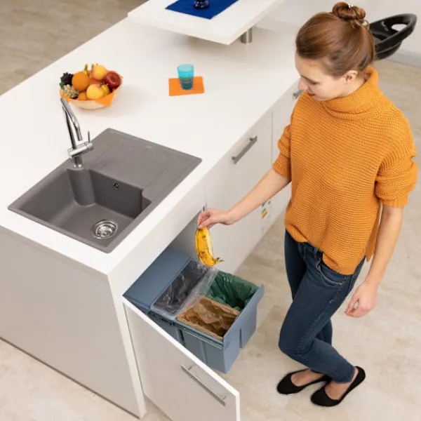 Dold avfallssortering förvandlar ditt kök till ett organiserat, rörigt utrymme. Detta innovativa system passar sömlöst under diskbänken och erbjuder effektiv avfallshantering utan att kompromissa med utrymmet.