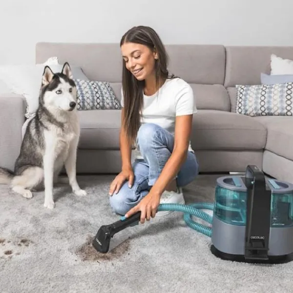 Cecotec Conga 4000 fläckborttagare tar effektivt bort fläckar på mattor och ytor. Med 600W och 14 kPa erbjuder den en djupgående rengöring. Dess dubbla tank separerar rent och smutsigt vatten, och den inkluderar ett fönsteraccessoar och tre sugborstar för optimal mångsidighet.