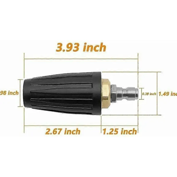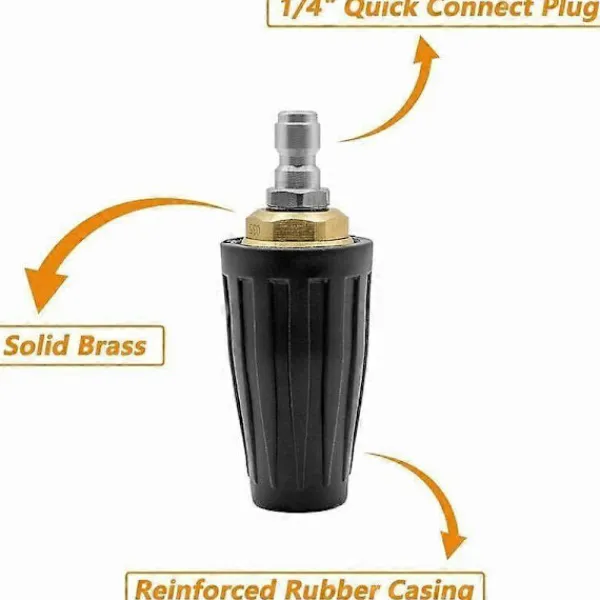Högkvalitativt materialDet roterande högtryckstvättmunstycket med mässings- och rostfritt stålkonstruktion. Detta roterande turbomunstycke är rost- och korrosionsbeständigt, med ett kraftigt smidd mässingshus, vilket ger ett långvarigt tillbehör.Kraftfull stötDet roterande turbomunstycket använder centrifugalkraft för att producera en stark effekt och sprutmönster. Munstycket ger ytterligare rengöringskapacitet till rengöringsprocessen och ger den tuffaste rengöringen i kraftigt smutsade områden eller områden med hög trafik.Tidsbesparande och effektivitetDessa högtryckstvätt turbomunstycken hjälper till att minska rengöringstiden genom att använda roterande flödesverkan och ett vidvinkelstrålmönster, de är utformade för att ge 200% högre rengöringseffektivitet än standardkonventionella fläktstrålmunstycken.Utmärkt prestanda Skapar en kraftfull vattenström, idealisk för rengöring av mycket smutsiga tegelstenar och stora mängder smuts.Hög prestanda och precision.Den kan fungera länge.Dess kraftfulla slag gör den idealisk för rengöring av stora plana ytor som uppfarter och uteplatser.Bred tillämpbarhetDet roterande högtryckstvättmunstycket kan användas på de flesta högtryckstvättar.Idealisk för att ta bort rost, rengöra metall- eller plasttankar, rengöra båtar, rengöra smutsiga garagegolv, ta bort färg från träexteriörer och ta bort lera och lera från väg- och byggutrustning.Tar enkelt bort smuts och alger från uteplatser, däck, stigar, stenläggare, väggar och utemöbler.Roterande turbodesign för att öka rengöringseffektiviteten hos högtryckstvätten.Användning 1. Skapar en kraftfull vattenström.Vatten med högt flöde kan rengöra kraftigt smutsade områden snabbt, enkelt och effektivt.Och idealisk för att ta bort stora mängder smuts.2. Varning: Tätningstejp eller lim bör appliceras på 1/4″ snabbkopplingsuttaget för att förhindra läckage före användning.