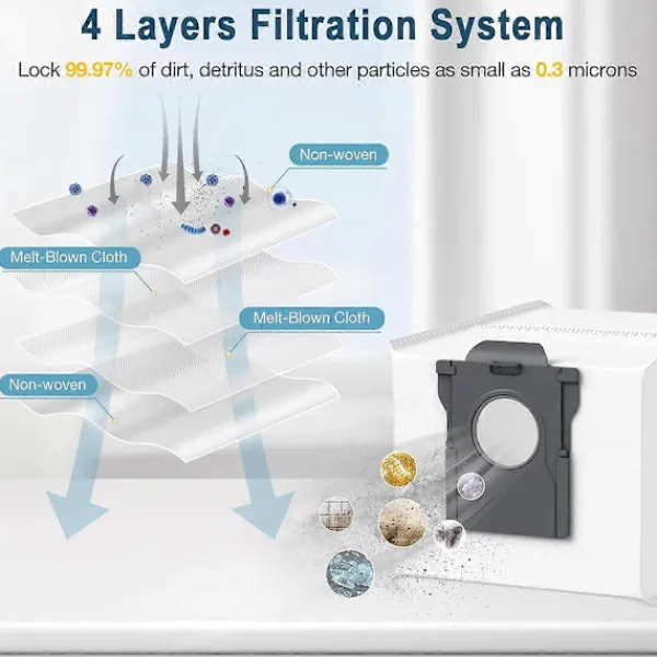 Utmärkt Förseglad Design – 3L stor dammuppsamlingspåse har en stark försegling som effektivt kan förhindra att damm läcker ut och säkerställa att dessa partiklar är fastsatta i dammsugarpåsen och aldrig släpps tillbaka ut i luften. Våra X30 Ultra och L10s Pro Ultra ersättningsdammsugarpåsar är tillverkade av högkvalitativt material, förhindrar dammexplosioner vid byte av dammsugarpåse.