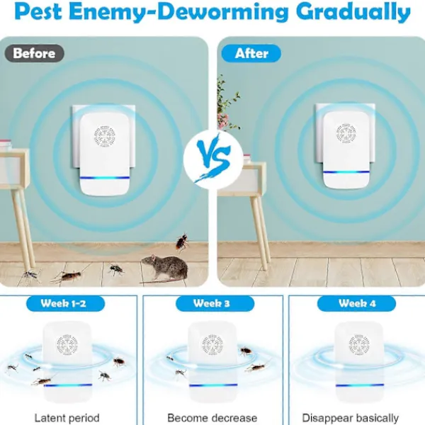 Anmärkningsvärd effekt Det är normalt att upptäcka att aktiviteten hos möss och skadedjur har ökat markant några dagar före användning. Oroa dig inte! Eftersom möss och insekter som vanligtvis gömmer sig i sina bon attackeras av ultraljudsvågor kommer de att fly från sina ursprungliga gömställen efter varandra. De flesta kunder får tillfredsställande resultat inom 3-4 veckor!