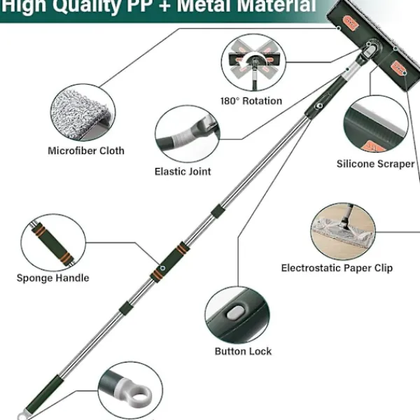 Multi-vinkelrengöring Dess flexibla fog löser perfekt problemet med böjning och brott vid torkning av höga platser, och den 180° roterande designen kan rengöra alla svåråtkomliga platser. Svampen är tillsatt till handtaget, vilket är bekvämt och minskar din rengöringsutmattning. Lätt att förvara och kan hängas på kroken utan att ta upp mycket utrymme.