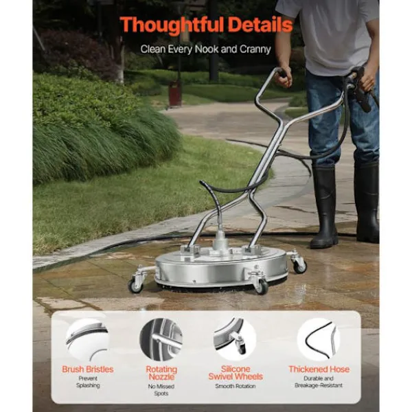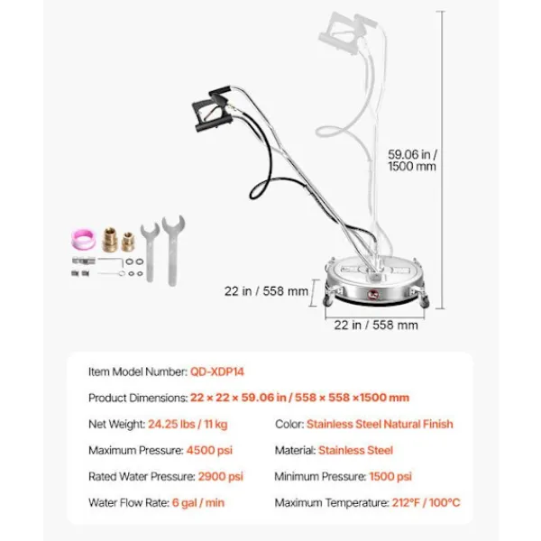 Yttrengöraren DUOKU QD-XDP14 är designad för högtryckstvättar. Med en bredd på 558 mm och ett maximalt tryck på 4500 psi är den idealisk för att rengöra betong och uteplatser. Tillverkad i rostfritt stål är den hållbar och lätt att manövrera tack vare sina hjul. Vattenflöde på 27,3 L/min för effektiv rengöring.