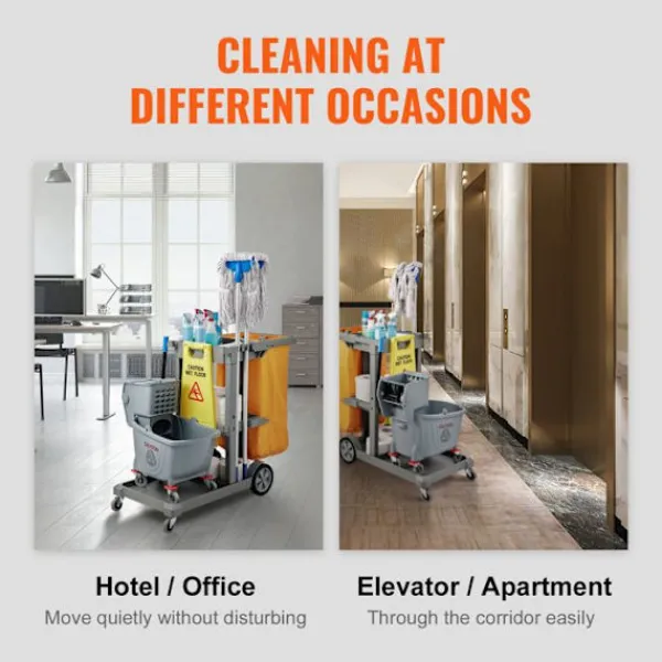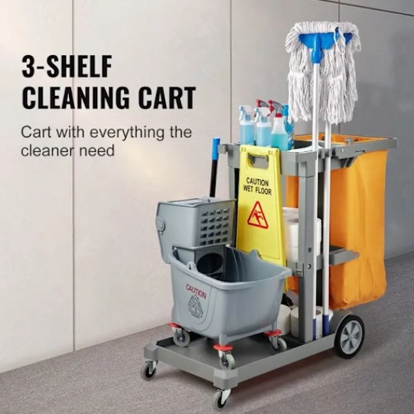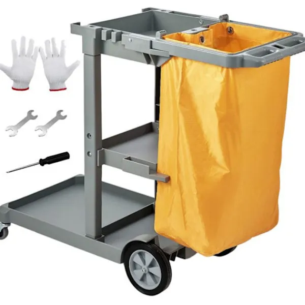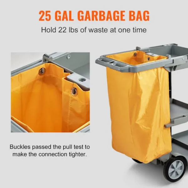 Produktdimensioner (B x D x H): 120 × 51 × 98 cm (47″ x 20″ x 38,6″)>Artikelns vikt: 12,2 kg (27 lb)>Kapacitet: 90,7 kg (200 lb)>Material för vagn: PP>Volym av soppåse: 94,6 L (25 gallons)>Material av påse: PVC>Typ: Rengöringsvagn med 3 hyllor