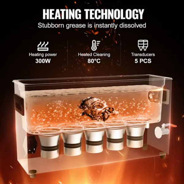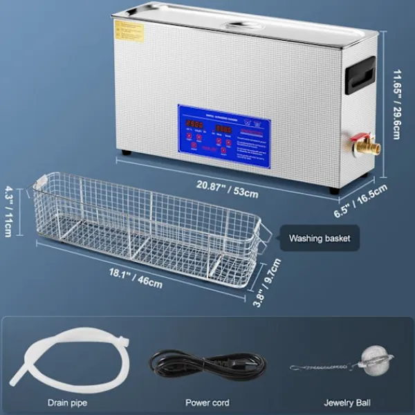 Kapacitet: 10 L > Frekvens: 40 kHz > Ultraljudseffekt: 300 W > Värmeeffekt: 300 W > Bullernivå: ≤ 75 dB > Tidskontroll: 0 till 30 minuter > Temperaturrange: 0 till 80 °C > Dimensioner för inre behållare i rostfritt stål: 500 x 135 x 150 mm (väggtjocklek: 1,0 mm) > Ultraljudstransduktorer: 5 stycken > Längd på strömkabel: 1,5 m > Produktvikt: 7,4 kg > Produktdimensioner: 530 x 165 x 296 mm > Modell: MH-042S
