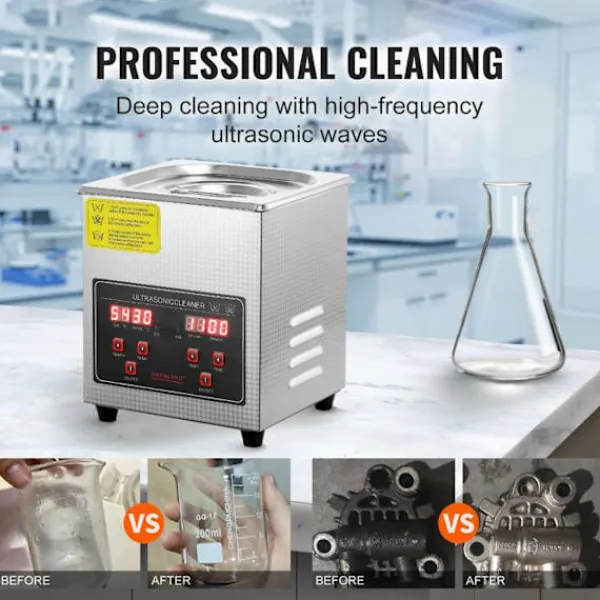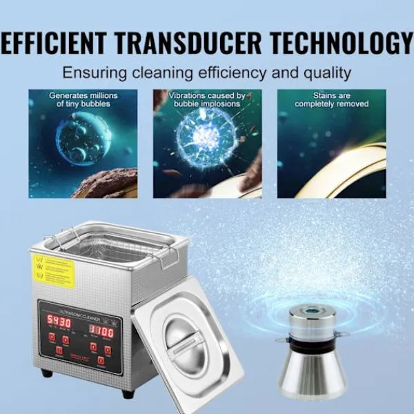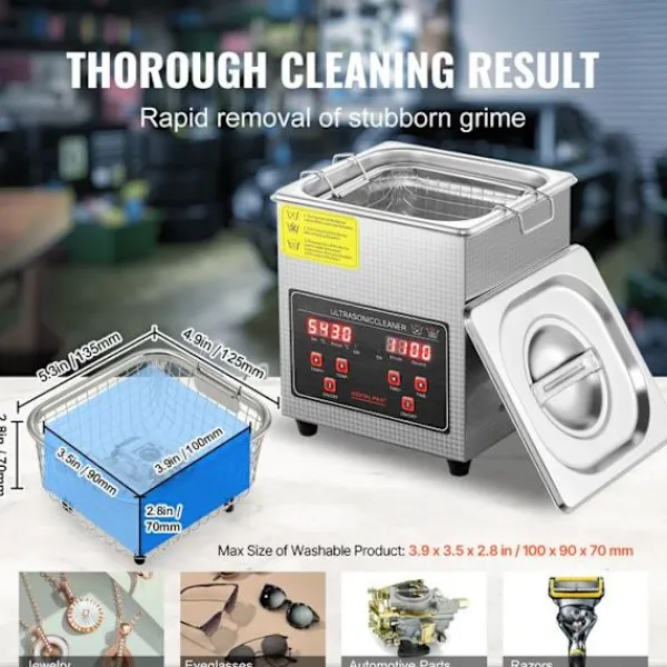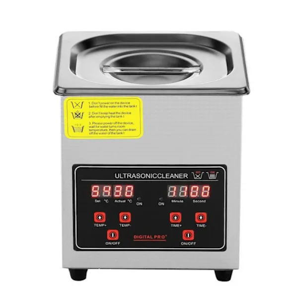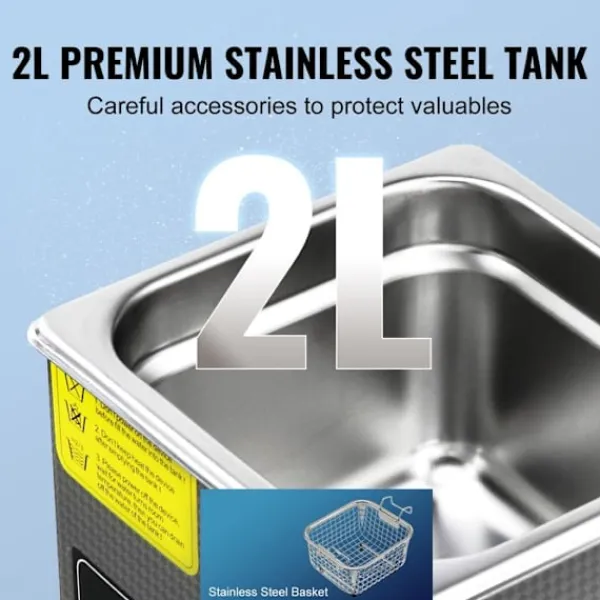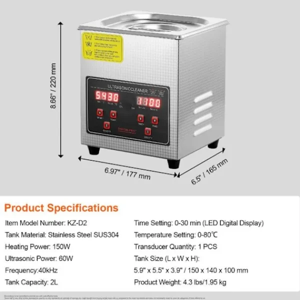 Antal transducorer: 1 > Tankens storlek (L x B x H): 150 x 135 x 100 mm (5,9 x 5,3 x 3,9 tum) > Produktens storlek (L x B x H): 175 x 165 x 190 mm (6,9 x 6,5 x 7,5 tum) > Produktens vikt: 1,95 kg (4,3 lb) > Tankkapacitet: 2 L > Tankmaterial: Rostfritt stål SUS304 > Värmeeffekt: 160 W > Ultraljudseffekt: 60 W > Frekvens: 40 kHz > Temperaturinställning: 0 °C – 80 °C > Tidsinställning: 0 till 30 min (LED digital visning)