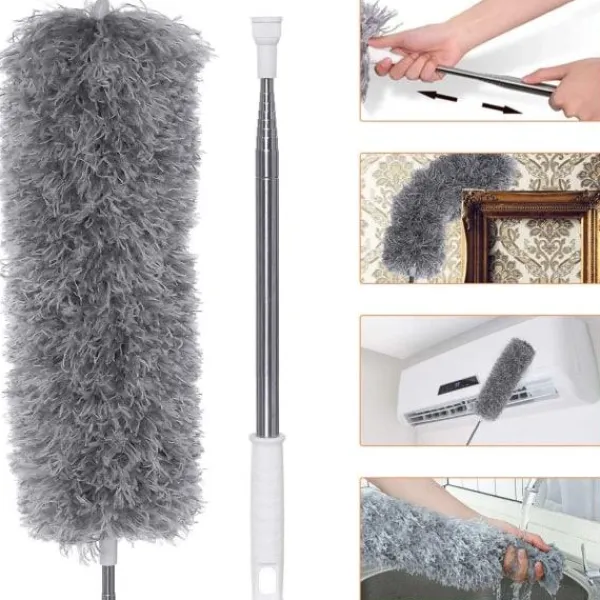 Med sin starka elektrostatiska adsorptionsförmåga kan mikrofiberhuvudet snabbt fånga upp och absorbera fint damm och hår från bilar, takfläktar och fotoramar, slumpmässig böjning och fri expansion, snabbt och enkelt Rengöra det stora området och spara halva rengöringstiden för dig. Lätt att tvätta. Vrid helt enkelt vevstaken moturs, ta bort mikrofiberhuvudet och skölj fiberborsten med varmt eller varmt vatten. Efter torkning naturligt fluffig kan den återanvändas!