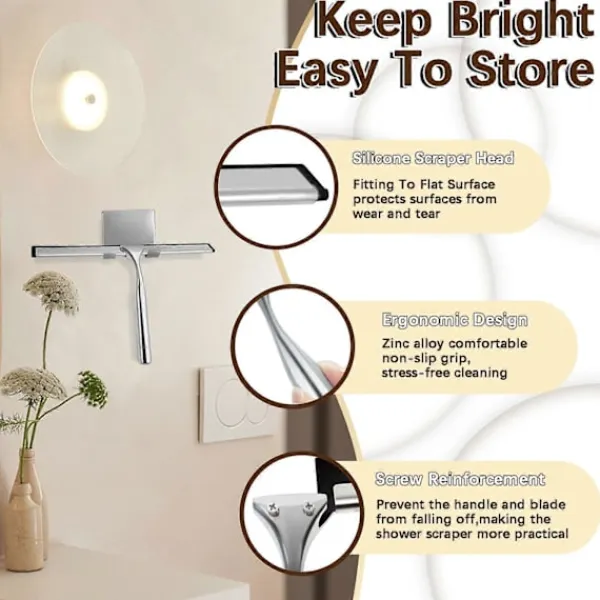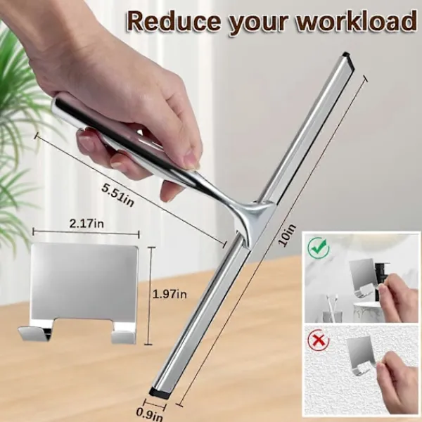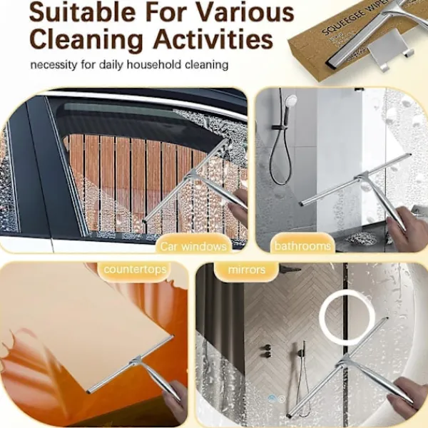 [Högkvalitativa material ger effektiv rengöring]–Duschrakan är tillverkad av ett integrerat handtag i zinklegering och en exakt skuren silikonraka i rostfritt stål. Det bekväma halkfria greppet och den mjuka silikonrakan kan enkelt ta bort fläckar och vatten utan att lämna några spår eller ljud. Den högkvalitativa fönsterrakan är inte lätt att rosta även om den förvaras i en fuktig miljö som badrummet under lång tid, och den behåller fortfarande sin hållbarhet och praktiska användning.[Dubbel design gör rengöringen enklare]–Duschrakan för glasdörrar kan passa tätt mot den plana ytan, och den mjuka och platta silikonbladet ger mer skydd för rengöringsytan och kan enkelt ta bort fläckar. Det ergonomiskt utformade handtaget kan enkelt hållas från vilken vinkel som helst, vilket minskar handtrötthet. Rakan för duschglas gör rengöringen mer effektiv, vilket skapar betydande rengöringsresultat med mindre kraft, vilket hjälper dig att ta bort fina föroreningar med lätthet.[Bygg ett rent och vackert hem]–För att förhindra att handtaget och bladet faller av, använder rakan för fönsterrengöring skruvar för att förstärka förbindelsen mellan dem. Den är utsökt och vacker, och kan enkelt och flexibelt ta bort vattendroppar på glaset. Den medföljande självhäftande kroken kan fästas på alla släta ytor. Efter att du har använt fönsterrakan för hemmet, skölj den med vatten och häng den på den självhäftande kroken för att rinna av, vilket kan minska besväret med att ta upp plats för dig.[Rengör som ny, bekväm]–Den enkla användningen av duschrakan för kakelväggar i duschen låter dig uppleva glädjen av montering. Först, använd en skruvmejsel för att lossa skruvarna på handtaget; för det andra, sätt rakan på sidan av handtaget och skjut den längs spåret; slutligen, rikta in skruvarna med hålen på rakan och dra åt dem. De enkla stegen gör ditt hushållsarbete enkelt och sparar tid och energi vid rengöring.[Njut av ett nytt liv]–Badrumsrakan för dusch används ofta. De är rengöringsverktyg som kan användas både inomhus och utomhus. De är mycket lämpliga för rengöring av glas, speglar, bänkskivor, väggar och andra släta och plana ytor. De kan effektivt ta bort vattenfläckar, hår, damm och annan smuts. De kan också användas med hushållsrengöringsmedel för att ta bort smuts samtidigt som de behåller glansen på den rengjorda ytan. De är en nödvändighet för daglig hushållsrengöring.