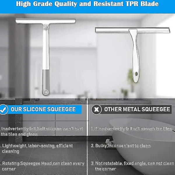 Längre handtag och blad Fönsterhandtaget är förlängt 13 tum med en ergonomisk greppdesign för att ge ett bekvämt, halkfritt grepp, och silikonbladet är 11 tum för att utöka rengöringsområdet. bekvämlighet och säkerhet vid rengöring av glas eller yttervägg, och minskar också din handtrötthet avsevärt. 360 rotation Nyligen uppgraderat vridbart huvud kan rengöra glas utan döda hörn och är också bekvämt för förvaring. Med detta silikon blir det enklare och enklare att torka glas eller skura köksbänkar eftersom det vridbara huvudet kan hjälpa dig att spara mycket ansträngning vid rengöring. Silikon Duschdörrskyddet är tillverkat av högkvalitativt silikon, som passar perfekt till glaset och rengör effektivt ytan, avlägsnar smuts kraftfullt utan mellanrum och ränder. glas eller gör ett hårt ljud. Det mjuka materialet kommer inte heller att gå sönder dina plattor. Uppmärksam service Vårt kundtjänstteam står bakom denna produkt i 24 timmar. Om du har några problem med produkten, vänligen kontakta oss, vi hjälper dig att lösa problemet vid första tillfället.