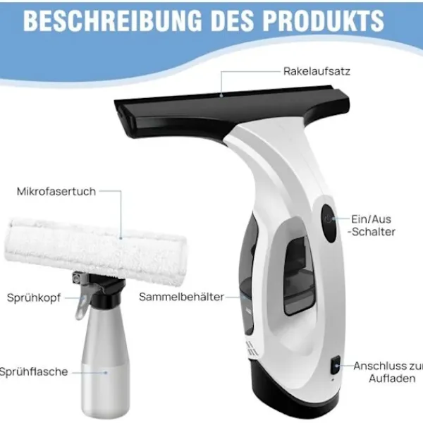 Kompakt och lättviktig: Denna sladdlösa fönstertvätt är kompakt och lätt, väger endast 0,85 kg, vilket gör den enkel att integrera i din arbetsyta och förenkla rengöringen. Uppladdningsbar: Ett inbyggt 2000 mAh batteri varar i 30 minuter på full laddning, vilket sparar tid vid fönsterputsning utan frekvent laddning. Dropp- och reptålig: Detta elektriska fönsterrengöringsset har kraftfull sugförmåga och en 28 cm bred mjuk gummiskrapa för att enkelt ta bort vattenfläckar. Mångsidig: Setet innehåller en fönsterputsare med en 28 cm gummiskrapa och en sprayflaska med en 24 cm mikrofiberduk, vilket gör det enkelt att rengöra fönster, duschar, kakel, speglar och mer. Tidsbesparande och effektiv: Säg adjö till sladdar och kontakter. Rengör dina fönster utan repor på några sekunder, vilket sparar tid och energi. Tekniska specifikationer: Batteri: 3,6V 2200mAh uppladdningsbart batteri; Laddningstid: cirka 3 timmar; Batteritid: 30 minuter på full laddning; Rengöringsvinkel: 360 grader; Vattentät: IPX4; Munstycksbredd: 28 cm; Vattentankens kapacitet: 150 ml; Sprayflaskans kapacitet: 300 ml; Strömkabel och kontaktlängd: 1,2 m