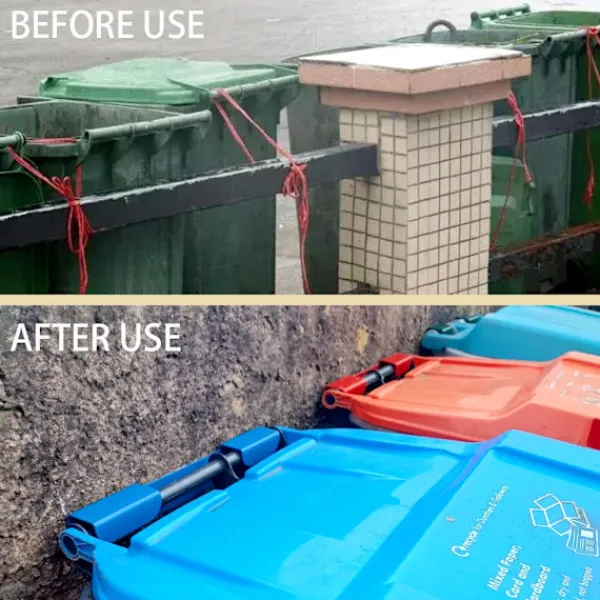 Stabil installation: Designad med robusta fästen, kan hjulbehållaren fästas säkert på en vägg eller stolpe för att förhindra tippning eller rörelse.