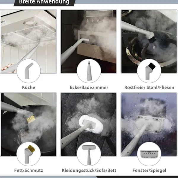 Brett utbud av applikationer: Vår mångsidiga ångtvätt är lämplig för en mängd olika ytor, såsom fläktar, mikrovågsugnar, soffor och grillar. Det håller ditt kök, vardagsrum och sovrum rent och snyggt. Dessutom tar den minimalt med utrymme, vilket gör den enkel att förvara även i trånga utrymmen.