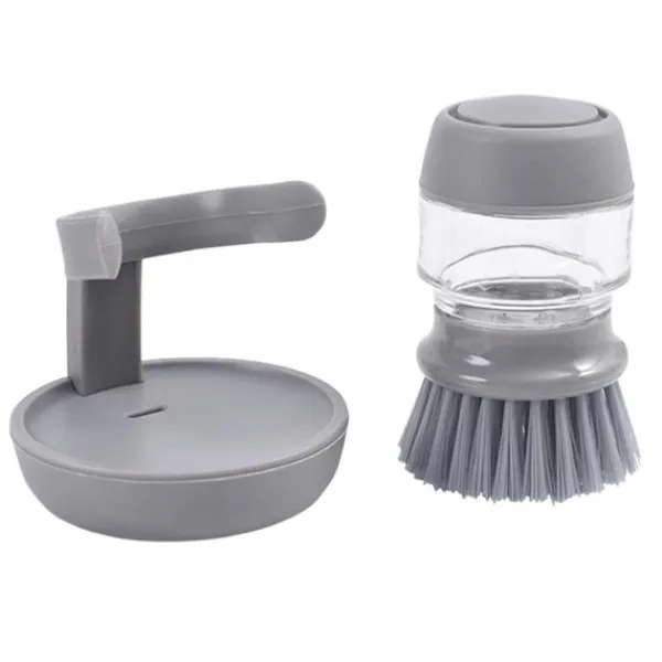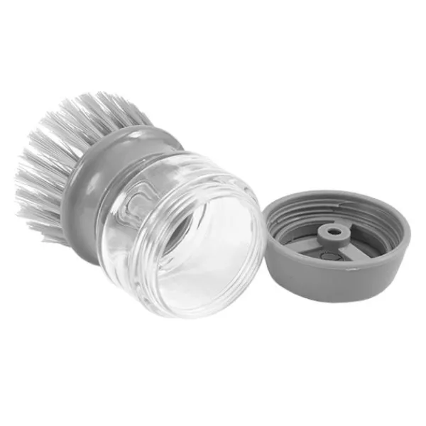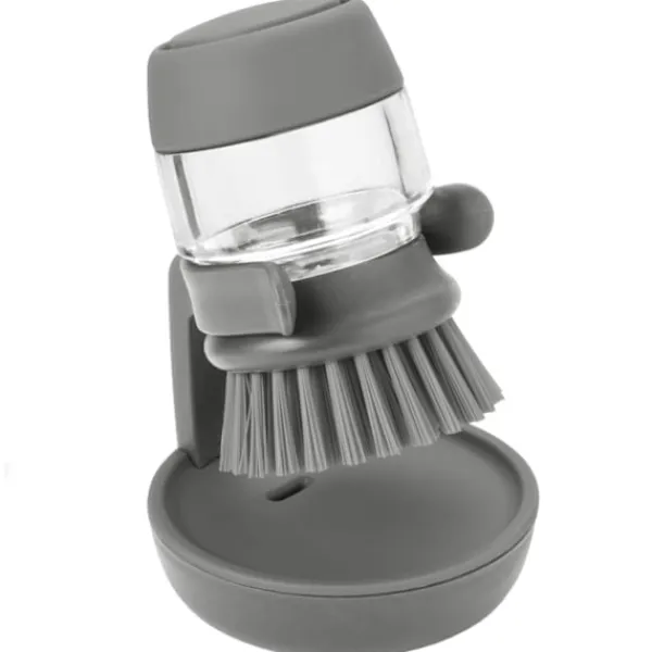 Med en diskborste med en inbyggd diskmedelsbehållare blir diskandet hemma mer effektivt. Du fyller helt enkelt diskborstens behållare med diskmedel, och när du trycker på knappen på borstens ovansida pumpas diskmedlet ut genom borsten. När du har diskat klart kan du sätta diskborsten i det medföljande stället och låta den rinna av. Överblivet vatten och diskmedel rinner ner i behållaren i ställets underdel, som du sedan kan tömma.