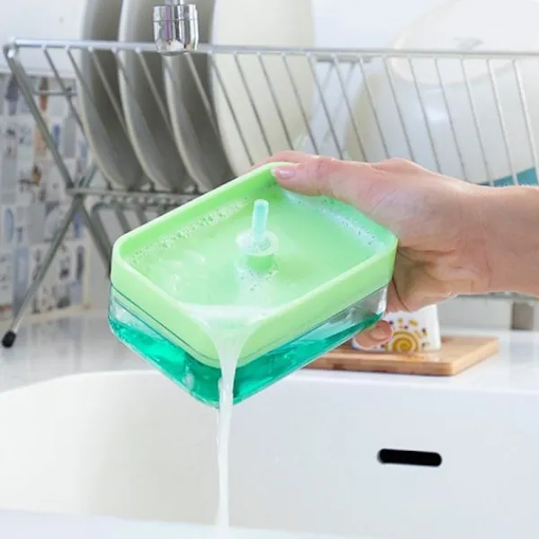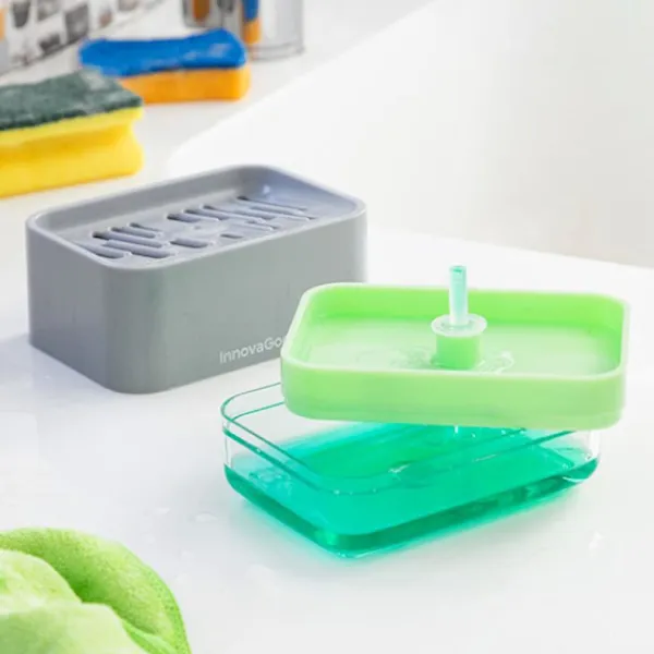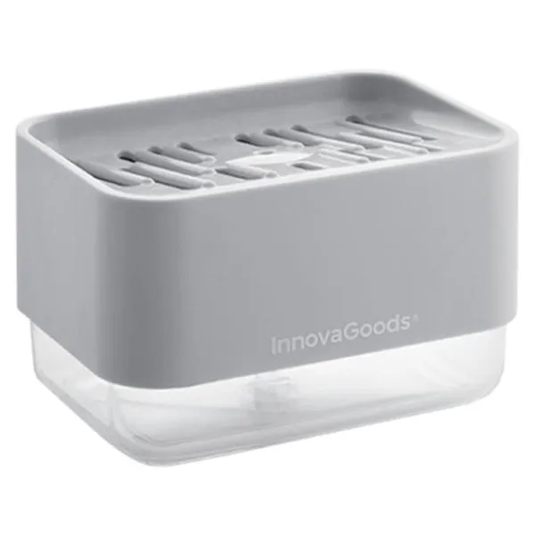 En diskmedelspump gör det enklare att diska och städa samtidigt som du håller köket välorganiserat. Fyll behållaren med diskmedel och tryck ned kökssvampen på den gråa plattan så appliceras diskmedlet via pumpen. Diskmedelspumpen har även en droppbricka inuti för enkel uppsamling och tömning av vatten som runnit ned genom dräneringshålen. Pumpen kan användas till alla typer av tvättsvampar och är enkel att ta isär för snabb och effektiv rengöring.