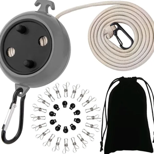 【VINDTÄT OCH HALKSÄKER】 Denna tvättlinuppsättning har utsidan innehåller en förvaringsväska, 10 fasta öglor och 20 löstagbara klädnypor. Den fasta spänndesigns kan förhindra att kläder glider och staplas, och den starka rostfria stålklämman kan hålla kläderna så att du inte behöver oroa dig för att kläderna blåser bort i blåsigt väder.