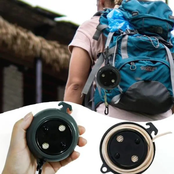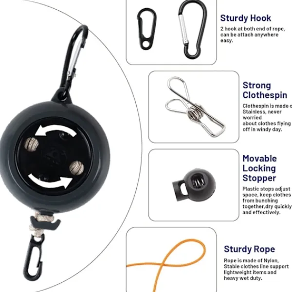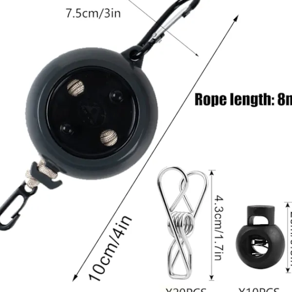 【KOMPAKT OCH LÄTT】 Denna campingtvättlina placerar en 8 meter lång tvättlina i en rund låda med 7,5 cm i diameter och 3,5 cm tjock. Den kan hållas upprätt. en hand, oavsett om den placeras i en handväska eller direkt i en byxficka, är mycket platsbesparande. Den metallkroksdesignen kan också göra att den hänger på resväskan, vilket är mycket lämpligt för utomhusaktiviteter.