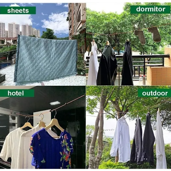 【BREDT ANVÄNDNINGSOMRÅDE】 Denna bärbara tvättlina är ett mångsidigt rep, den kan användas genom att justera längden efter behov, den kan användas nästan var som helst, lämplig för inomhus och utomhus, hotell, resor, affärsresor, studentboende, tvättstuga, den kan också användas som campingtvättlina, tältfixeringsrep, fiskehjälprep, reservrep, etc.