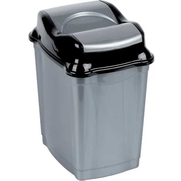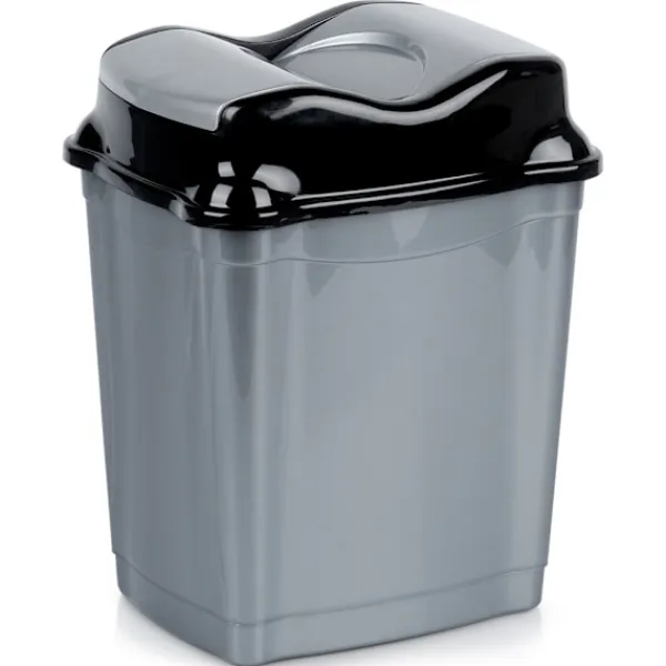 En 9-liters papperskorg tillverkad av slitstark plast i en blank grå färg. Har ett svänglock för enkel avfallshantering.