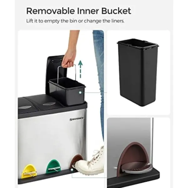 Vad du får: en 24L skräpfack med 3 sektioner, olika färgade pedaler och avtagbara inre hinkar för enkel avfallshantering och problemfri återvinning
