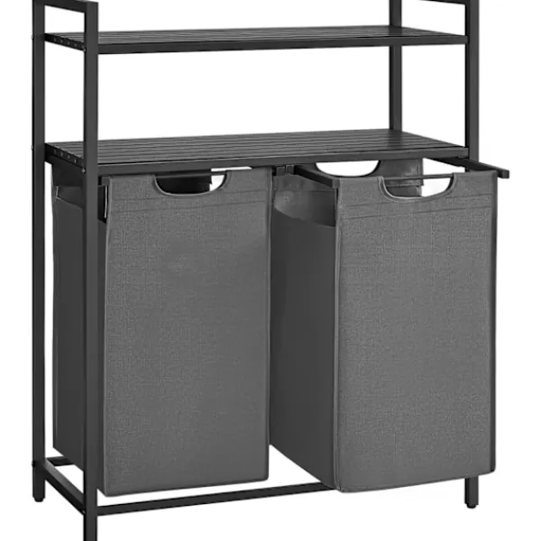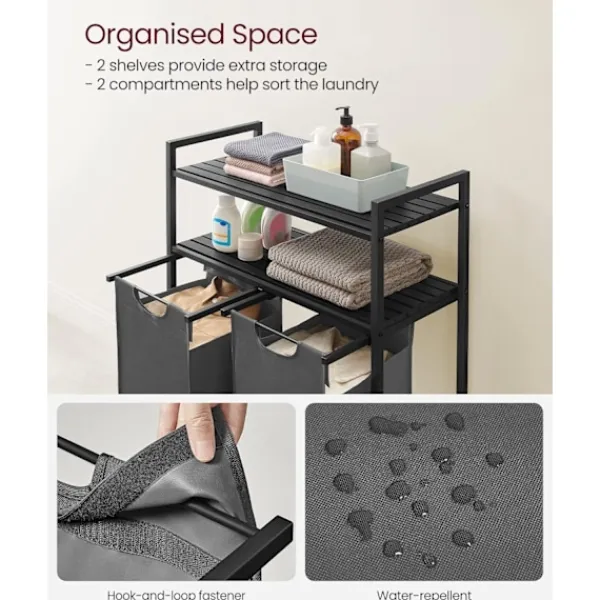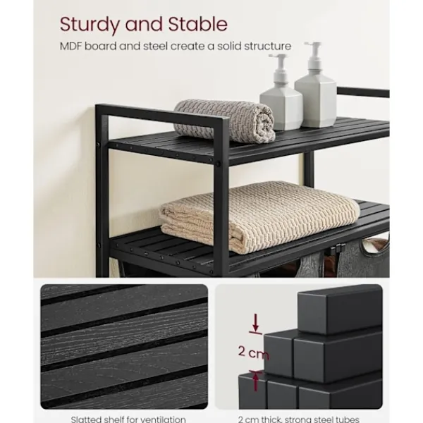 Mångsidig användning: Perfekt för att hantera allt från smutsiga kläder till förvaring av vikta kläder och andra hushållsartiklar. Dess två hyllor ger extra utrymme för att hålla dina nödvändiga redskap nära till hands.