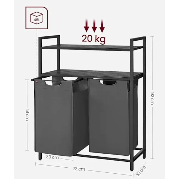 Med en kapacitet på totalt 92 liter (46 liter per fack) hjälper denna tvättsorterare dig att enkelt dela upp kläder efter färg eller material.