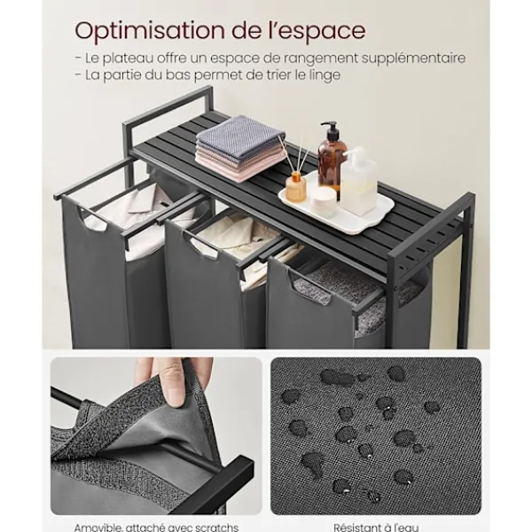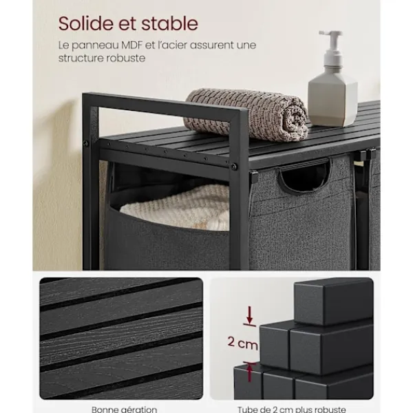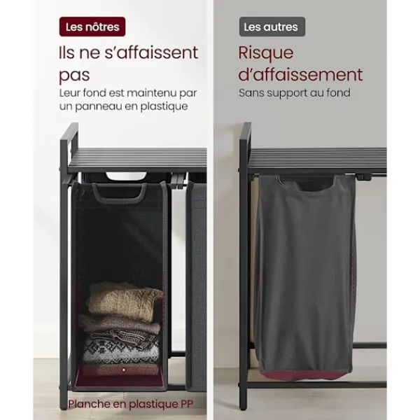 Tvättkorgen är tillverkad med en stålram på 2 cm och väskor i vattenavvisande Oxford-tyg för långvarig hållbarhet. Justerbara fötter ger stabilitet även på ojämna ytor. De avtagbara väskorna gör det enkelt att transportera kläder direkt till tvättmaskinen.