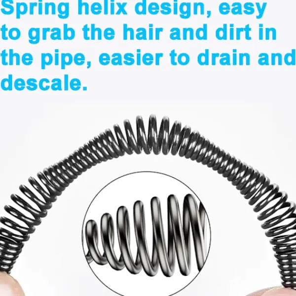 【Flexibilitet och hållbarhet】Den flexibla fjädern på avloppsrensaren kan böjas mer än 90 grader, vilket gör att den enkelt passerar genom komplexa rörstrukturer och är inte lätt att bryta eller böja; det yttre skalet är tillverkat av trumliknande ABS, och den inre stålkabeln är 65 manganstålfjäder, vilket är rostfritt och korrosionsbeständigt, hållbart