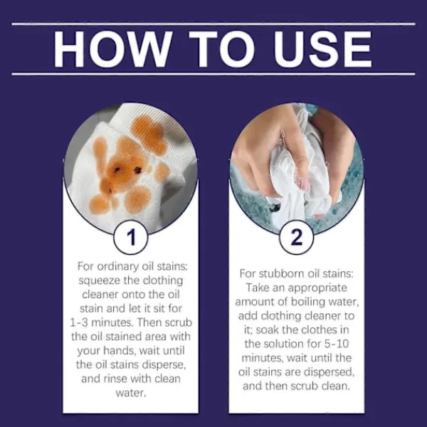Våra tvättmedel innehåller laurylpolyeter-7 och natriumlaurylpolyetersulfat. Det kan användas för svåra fläckar, inklusive vita fläckar och envisa fläckar, för att hjälpa dina kläder att bli rena igen. Användningsmetoden är mycket enkel: för vanliga fläckar: pressa tvättmedlet på fläckarna och låt det sitta i 1-3 minuter. Tvätta sedan fläckarna med båda händerna tills fläckarna är dispergerade och skölj sedan med rent vatten. För envisa fläckar: ta en lämplig mängd bingvatten och tillsätt klädrengöringsmedel; Blötlägg kläderna i lösningen i 5-10 minuter tills fläckarna sprids, skrubba sedan bort dem. Och fläckborttagning kan också fungera som ett pålitligt rengöringsmedel för envisa fläckar på tyger eller andra hushållsartiklar.