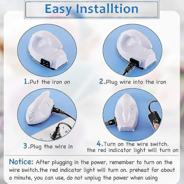 Brett användningsområde: Den lilla strykmaskinen är lämplig för olika tygmaterial som ull, polyester, plysch, siden, fiber, nylon, sammet och linne; lämplig för hantverksälskare och hemmafruar, och kan också användas som en praktisk present till släktingar och vänner; Obs: Sätt i efter att strömmen är påslagen, kom ihåg att slå på strömbrytaren, den röda indikatorlampan lyser och sedan kan den användas efter förvärmning i cirka en minut. Dra inte ur kontakten när du använder
