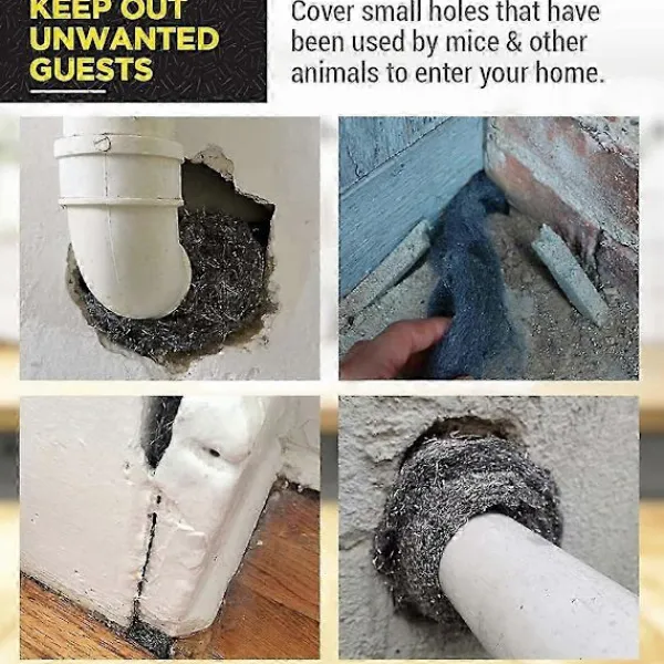 Bred användning – Fin stålull skyddar effektivt mot att möss eller små varelser tränger in genom smala utrymmen, och den kan användas för att fylla inomhus och utomhus, till exempel hus, garage, kontor, kök, vind, radiatorrör, utrymme runt rör, olika dräneringshål.