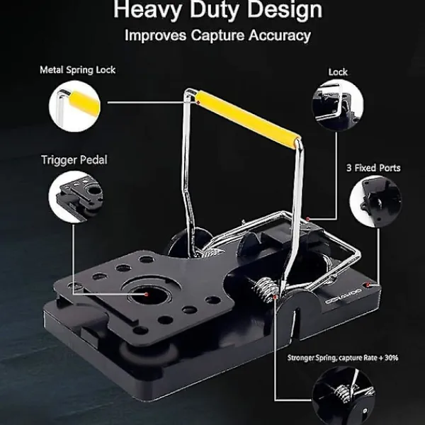 Högre fångsthastighet Vår råttfälla har inbyggda tjocka och känsliga fjädrar som är mer effektiva och mer känsliga än traditionell råttfälla. Större storlek och tjockare fjäder, högre känslighet, 30 % ökning i fångsthastighet Förbättrad stor design Till skillnad från de små små fällorna är den svarta stora fällan 14 cm lång och 7,5 cm bred, vilket gör den till den mest populära på marknaden. Största råttfällan. Oavsett om det är en mus, en råtta eller en sork kan han lätt fånga dem. Lätt att använda och mångsidig. Vår humaniserade råttfälla är lätt att använda, så länge du lägger betet i attraktionskoppen och låser metallstången i baksätet. Det är allt. Placera sedan råttmördaren nära hörnet och vänta på att råttan ska fångas. Musfällan kan placeras på flera ställen både inomhus och utomhus Lätt att rengöra och återanvändbar Gnagarfällan är lätt att rengöra, tvätta bara fällan med vatten och torka den. Som sådana kan de återanvändas för flera fångster under hela säsongen, kostnadseffektivt och spara pengar. Miljövänlig och kvalitetssäkring Vår nya och förbättrade råttfälla är bättre än råttfälla i trä, elektrisk råttfälla, klibbiga dynor, gnagaravvisande medel.