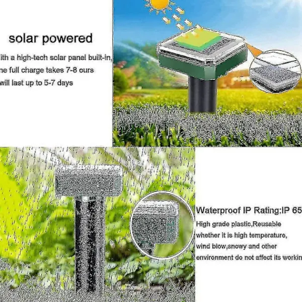 SONISKA PULSER – Den soldrivna ormavvisaren för utomhusbruk skickar ut soniska pulser i den omgivande jorden. Ormarna kommer att uppfatta ljudpulserna som en källa till fara och sedan flytta sig bort från din trädgård och gård.