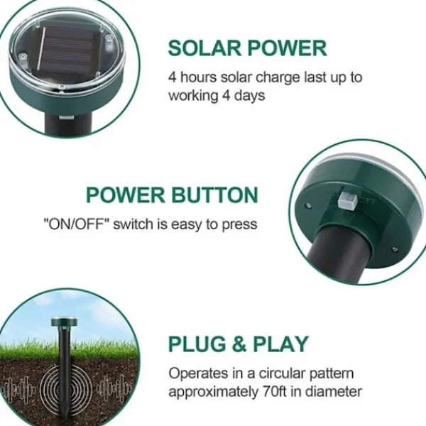 Lätt att installera — Inga kablar eller extern strömförsörjning behövs. Du behöver bara plantera de solcellsdrivna gnagaravvisarna i marken och trycka på knappen så börjar de fungera omedelbart. Utmärkt vattentät och regnsäker design, så den fungerar även i regn.
