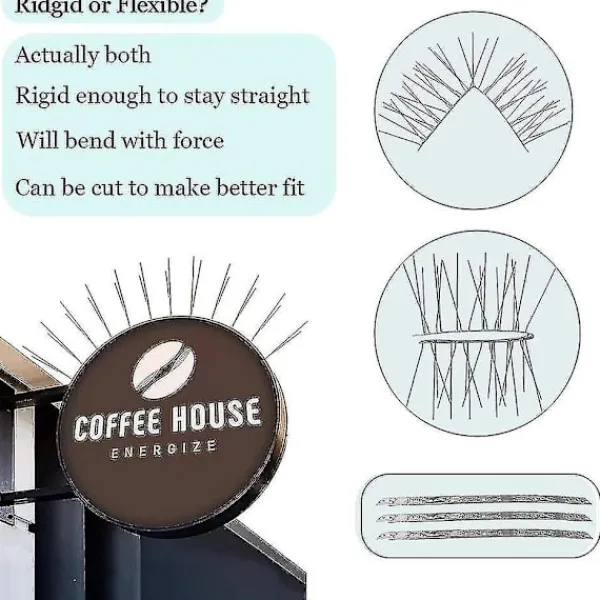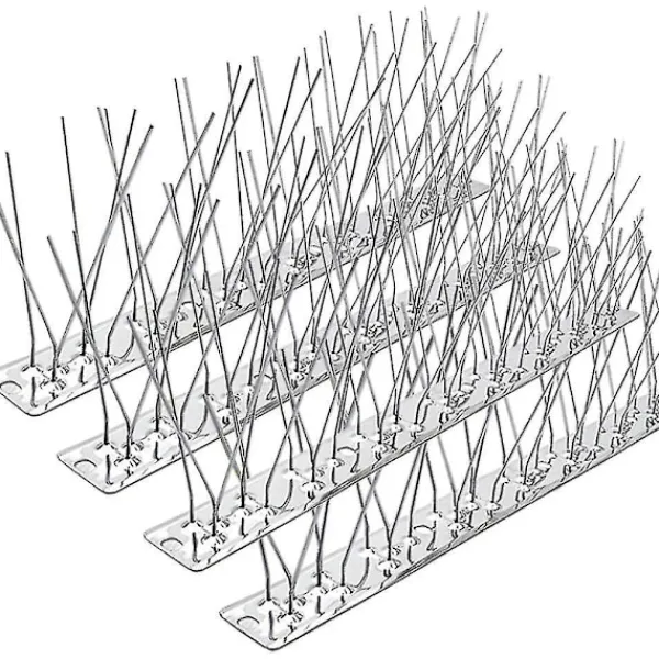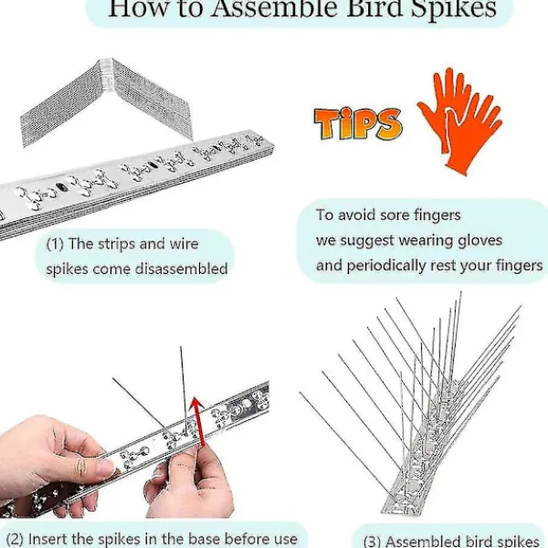 INGA FLER FÅGLAR SOM BYGGER BON OCH BAJSAR – fågelpiggar kan förhindra alla typer av fåglar från att landa och sitta på fönsterbrädor, i trädgårdar, staket, på tak och andra platser så att de inte smutsar ner eller bygger bon i dessa områden. Perfekt för små, medelstora och stora fåglar som sparvar, ladusvalor, rödhakar, duvor, måsar och andra. Dessutom fungerar dessa fågelpiggar även på ekorrar och tvättbjörnar. LÄTT ATT MONTERA OCH INSTALLERA – Detta set med duvpiggar levereras omonterat. Sätt helt enkelt in piggarna i basen innan du placerar fågelpiggarna där fåglarna sitter, bygger bon och bajsar. Det finns 4 hål (0,315×0,216) per remsa för monteringsändamål. Du kan förankra med en buntband, skruvar, dubbelsidig tejp, konstruktionslim etc. Dessa fågelpiggar för små fåglar och stora fåglar kan tas ner när du inte behöver dem eller sitta kvar året runt. VÄDERBESTÄNDIG KONSTRUKTION I ROSTFRITT STÅL – piggremsor för fåglar är gjorda av premium 304 rostfritt stål som inte rostar eller försvagas när det utsätts för väder och vind eller lämnar fula rostfläckar på din egendom. Dessa fågelpiggar i rostfritt stål är långa och väl positionerade för att förhindra att fåglar landar. Varje remsa är 13 lång och 1,15 bred. Bredden på piggarna upptill är 2,15, djupet från basen till toppen är 4. STYVA MEN KAN KLIPPAS ELLER BÖJAS FÖR BÄTTRE PASSFORM – Metallpiggarna på fågelpiggarna är ganska styva. Metallbasen är tillräckligt styv för att hålla sig rak, men du kan böja dessa fågelpiggar i rostfritt stål för att passa inuti och utanför hörn eller klippa dem för att passa in i kortare utrymmen. En bågfil/plåtsax/tång/avbitare kan klippa bort överflödigt material från piggremsan.