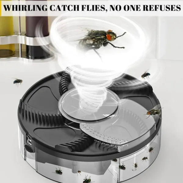 Infångningsprincip: Placera flugfällan på en plats där fruktflugor finns, och när flugorna festar sveper den roterande armen över dem och fångar dem inuti. De flyger in i uppsamlingsbrickan, där de kommer att dö efter några dagar. Dra ur kontakten
