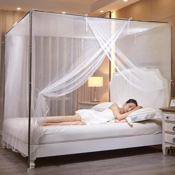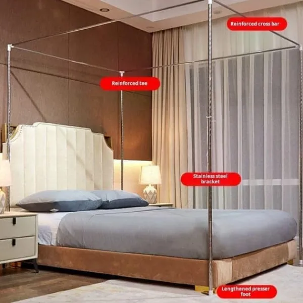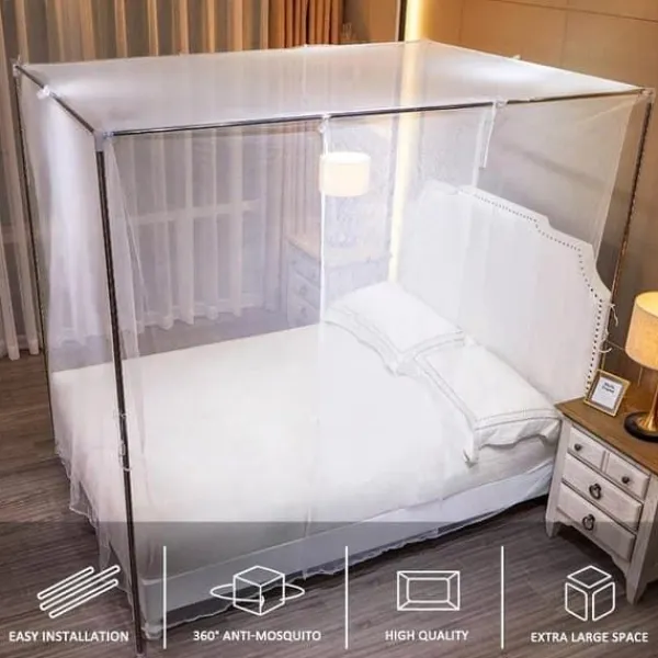 Till skillnad från vanliga myggnät är detta nät försett med ett robust rostfritt stålstativ och extra förlängda fotstöd som säkerställer hög stabilitet. Perfekt för både enkelsängar och dubbelsängar.