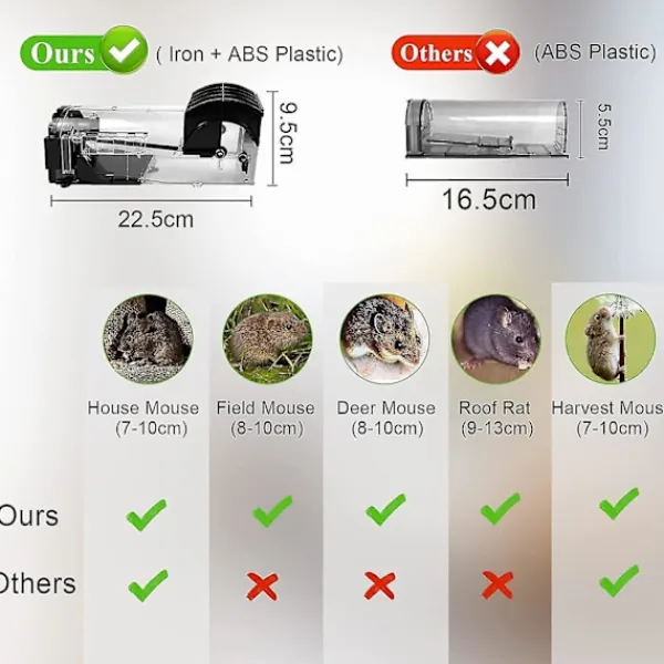 Hög kvalitet: De humana musfällorna är tillverkade av premium ABS-material, vi förstärker även baksidan med järnplåt och de kan inte rymma och springa iväg.