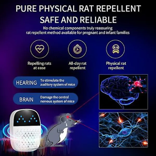 Dessa pulssignaler resonerar med ljudfrekvenserna hos möss och fladdermöss, vilket skapar superstarka tillståndspulser som stör och stimulerar råttans hörselsystem. Denna stimulering orsakar obehag, vilket leder till beteenden som aptitlöshet, flykt och till och med kramper, vilket effektivt driver bort råttorna.