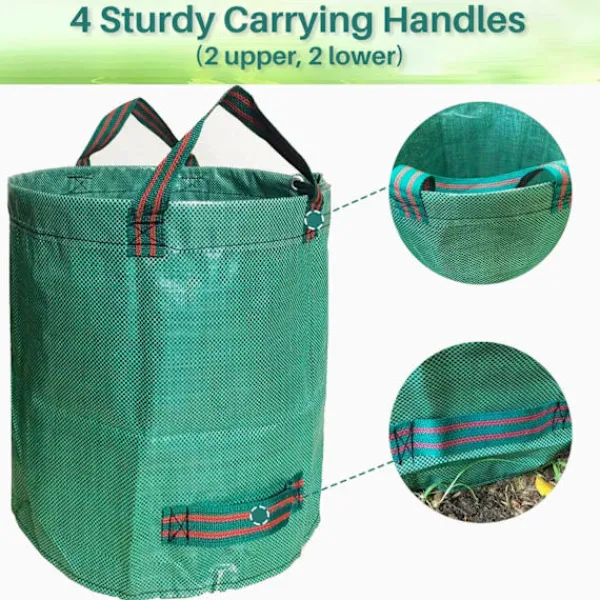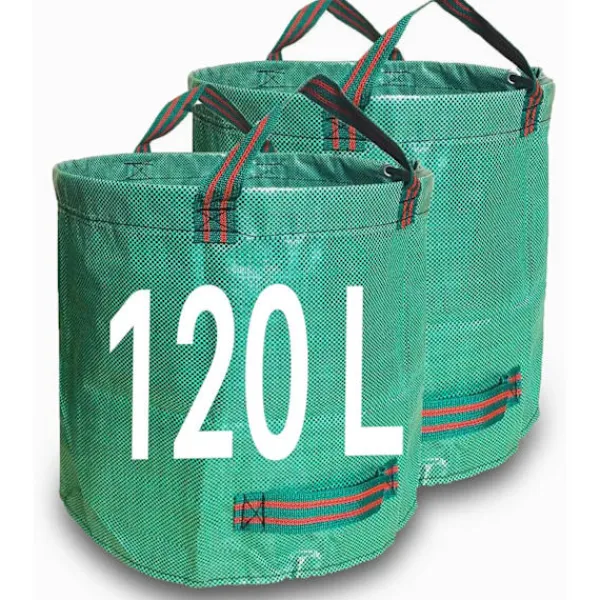 Stor storlek: 120 liter – Den stora säcken visar sig vara särskilt användbar för skrymmande material som grenar eller kvistar. Slitstarkt material: Avfallspåsen är tillverkad av starkt polypropen (PP) vävt tyg. Miljövänlig, lätt, hållbar, rivtålig och vattenavvisande. 4 handtag: Vår trädgårdspåse har 2 handtag på varje sida. Detta innebär att du alltid kan transportera eller tömma vår påse utan att behöva vända den. Stabil: Den flexibla ringen upptill hjälper till att hålla påsen öppen, vilket underlättar fyllning och tömning. OBS: Produkten levereras inte med ringen installerad. Den behöver installeras. Bra hopfällning: Om påsarna inte används kan du fälla ihop dem smått, eftersom det inte finns några skrymmande fjädrar.