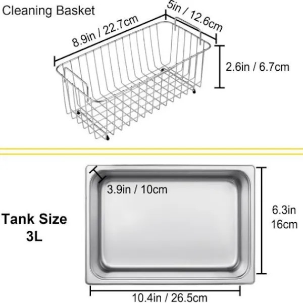 Tankkapacitet 3L: Ultraljudstvätten har en tankkapacitet på 3 L/0,8 gallon och levereras med en rengöringskorg för att minska friktionen under tvätten.