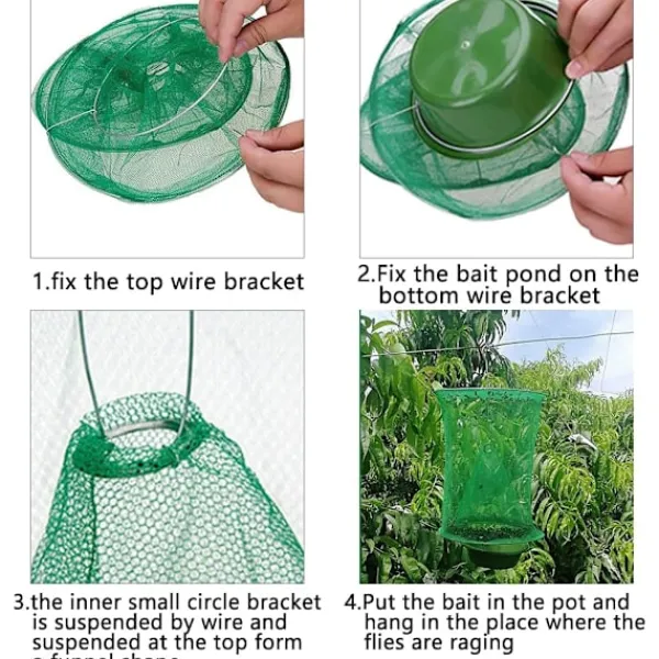 Lätt att använda: med krok, häng bara i 1 meter från marken. Vårsäsongen hänger i mycket solsken, sommaren hänger på mörka platser. Betet måste hållas fuktigt och det måste röras om med vatten för att uppnå lockeffekten. Och du kan tömma din flugfälla genom att koppla bort behållaren och vända nättratten.