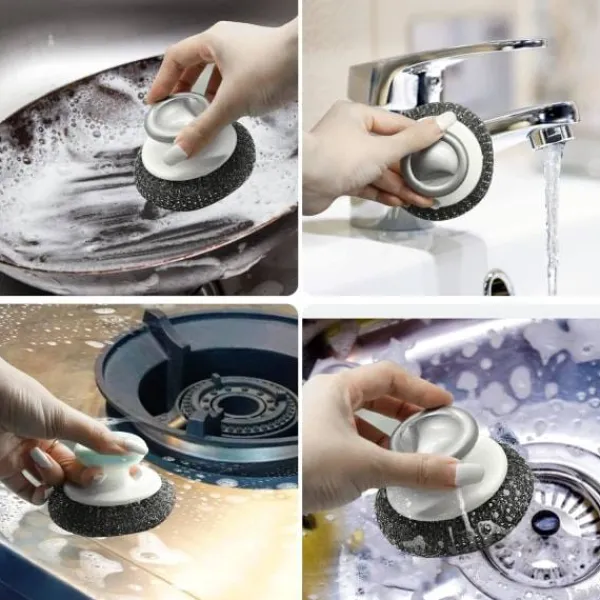 【Brett användningsområde】Rostfri stålsvamp med handtag är perfekt för användning i kök, badrum, garage eller utomhus, är lämplig för att skrubba kastruller, stekpannor, grillar, bakplåtar, tallrikar, diskhoar, köksfläktar, kranar, kakel, golv och mer. Rostfri stålsvamp borste är en bra hjälp för hushållsarbete, tar enkelt bort tuffa fläckar och fett.