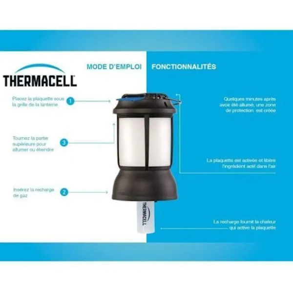 Thermacell-distributören erbjuder effektivt skydd mot myggor på ett område av 20m². Bärbar, luktfri och tyst, så att du kan njuta av dina kvällar utomhus utan att bli störd. Lättanvänd, den fungerar med en gaspatron och avvisande plattor. Perfekt för trädgården, terrassen eller runt poolen.