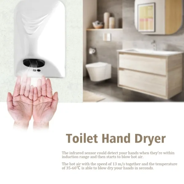 Den varma luften med en hastighet av 13 m/s tillsammans och temperaturen på 35-60℃ kan torka dina händer på några sekunder.