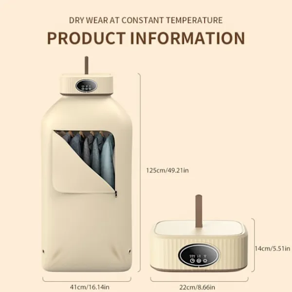 Denna Bärbara Klädtorkare är designad för effektivitet och bekvämlighet, vilket gör den till ett viktigt verktyg för alla som vill förenkla sin tvättrutin. Med sina snabba och effektiva torkningsfunktioner, tysta drift och timerfunktion är denna torktumlare perfekt för små bostadsytor och användning på språng.